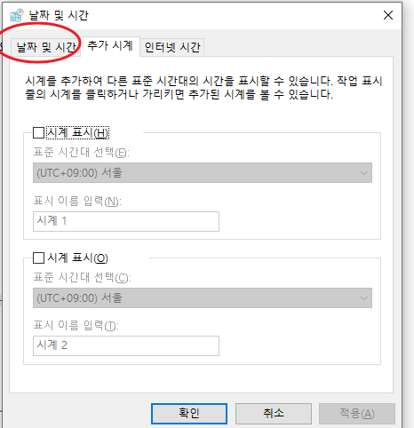 "다른 시간대에 대한 시계 추가"를 눌러주세요