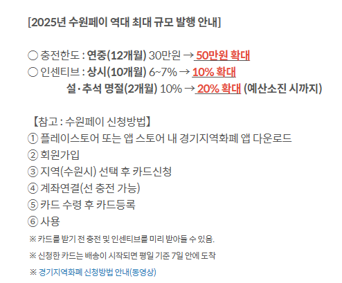 [2025년 수원페이 역대 최대 규모 발행 안내] ○ 충전한도 : 연중(12개월) 30만원 &r..
