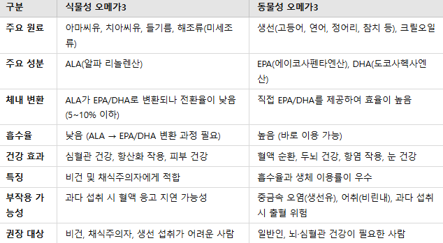 - 두뇌 건강: DHA가 풍부한 동물성 오메가3가 더 유리해요.