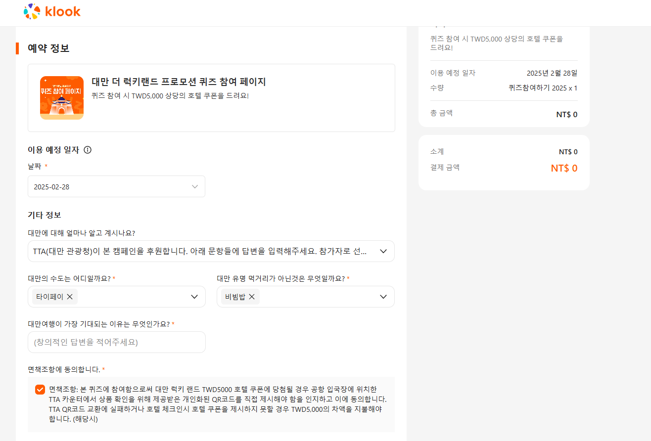 대만 더 럭키랜드 프로모션 퀴즈 참여 페이지 - 클룩 Klook 한국