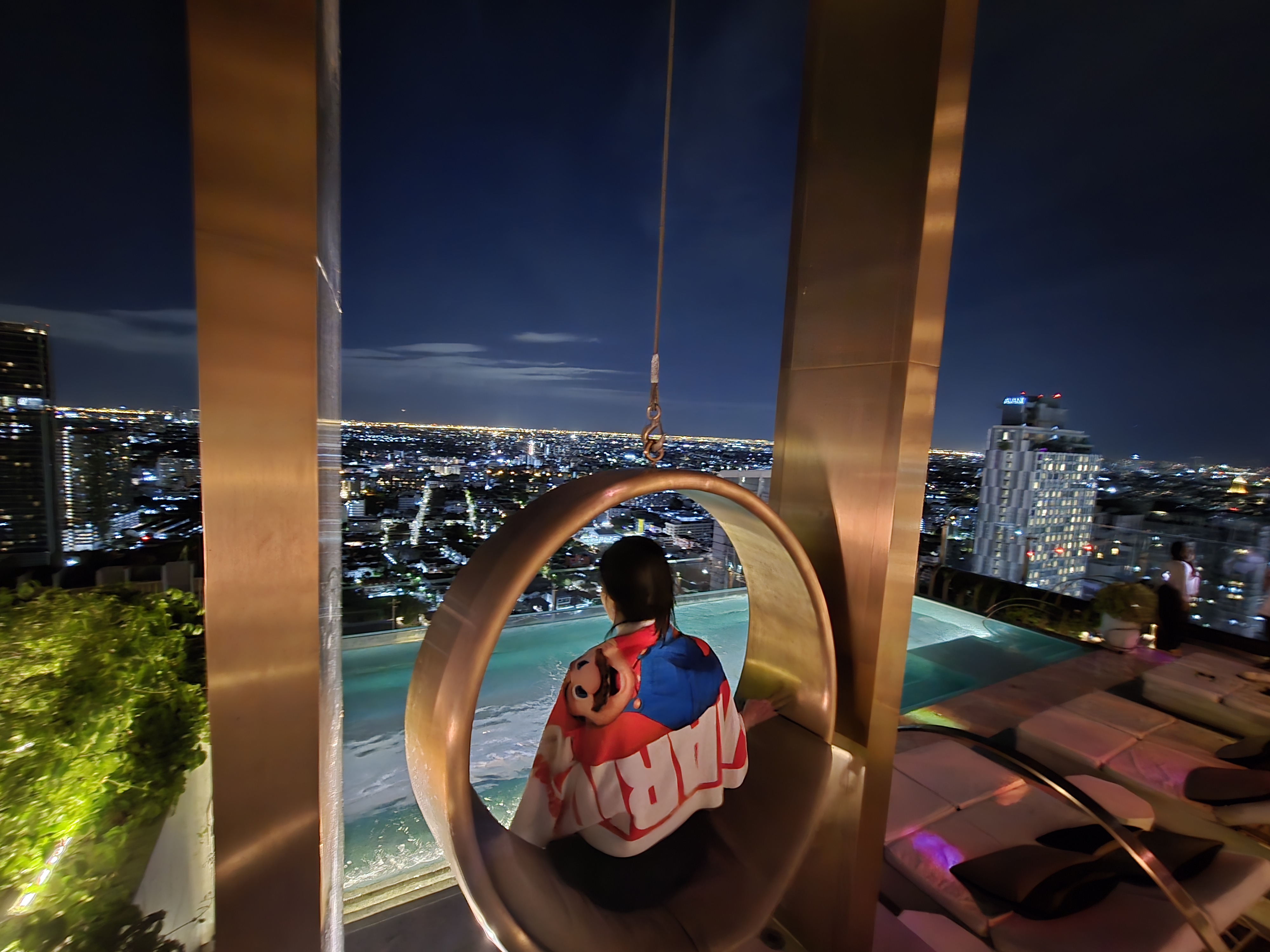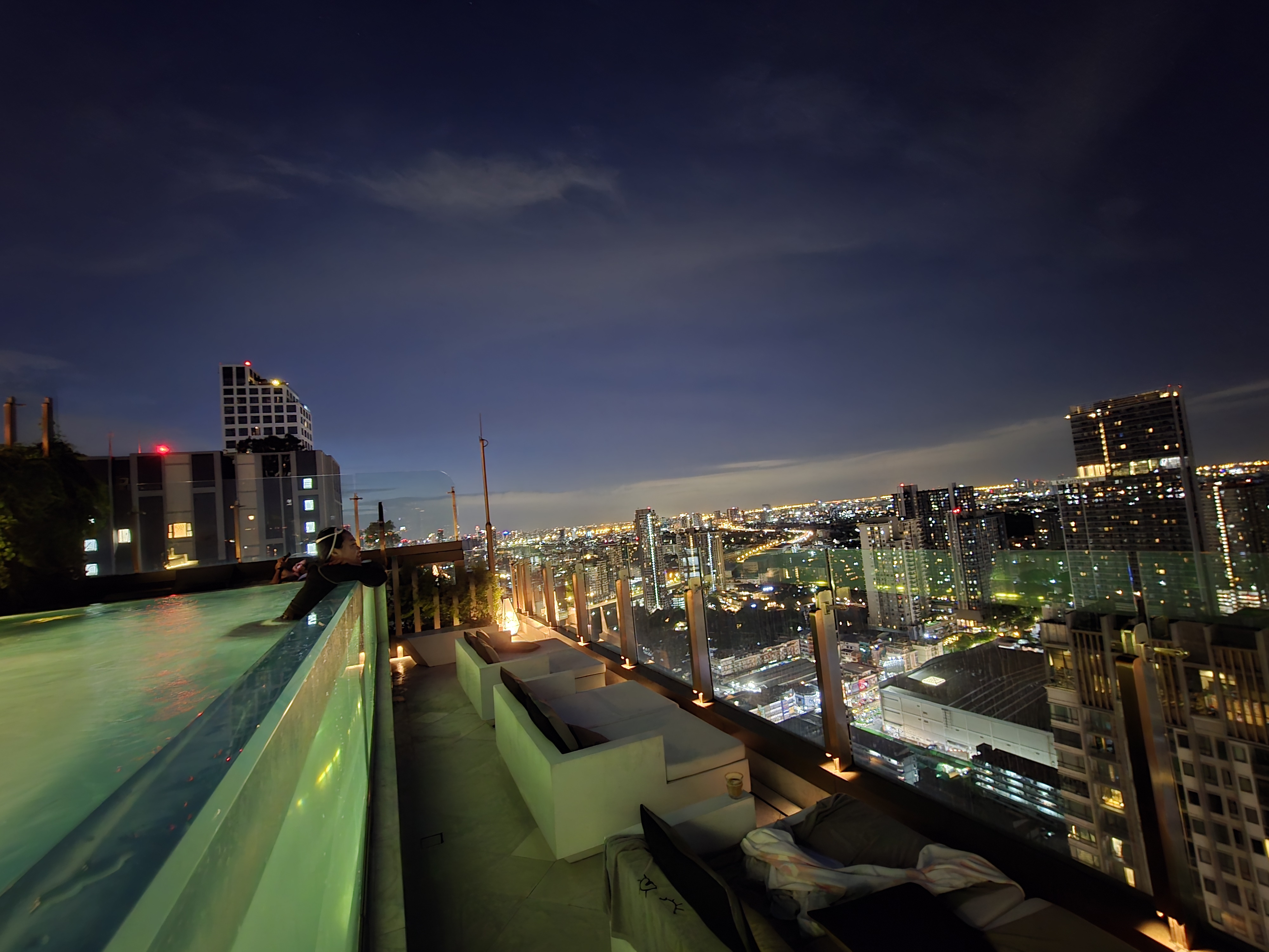 낮의 활기찬 분위기 대신 밤이 되면 수영장은 완전히 다른 매력을 뿜어냅니다. 방콕의 화려한 야경이 눈앞에 펼쳐지는데, 와… 진짜 입이 떡 벌어져요! 🌃